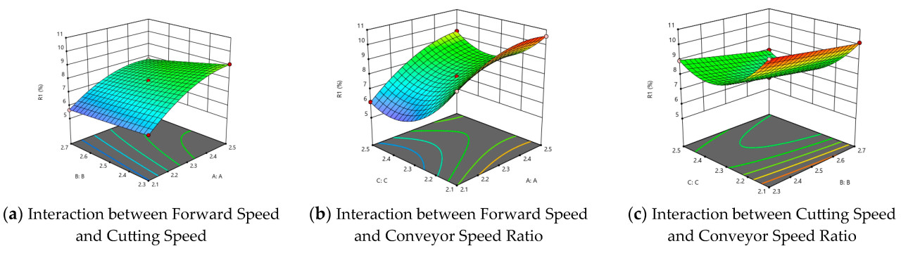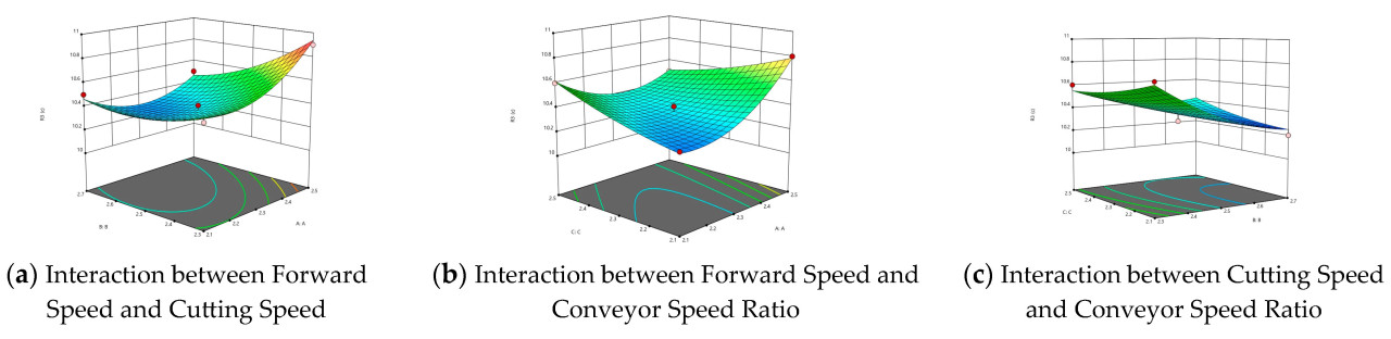 Анализ значимости модели коэффициента вариации высоты среза показывает, что ранжирование значимости факторов, влияющих на вариацию высоты среза: скорость среза > скорость движения вперед > коэффициент скорости конвейера. Значения p для X1X2 все <0,01, что указывает на то, что эффекты скорости движения вперед и скорости среза на вариацию высоты среза являются высоко значимыми. Анализ взаимодействия указывает, что все три фактора имеют парные взаимодействия, со значением p для X1X3 <0,01, что указывает на то, что взаимодействие между скоростью движения вперед и коэффициентом скорости конвейера на высоту среза является высоко значимым, а значения p для X1X2 и X2X3 оба <0,05, что указывает на то, что взаимодействия между скоростью движения вперед и скоростью среза, а также скоростью среза и коэффициентом скорости конвейера на высоту среза являются значимыми. Значение p для неадекватности составляет 0,3678 (>0,05), доказывая, что нет факторов неадекватности. На Рисунке 23 показаны графики поверхности отклика для парных взаимодействий каждого фактора.