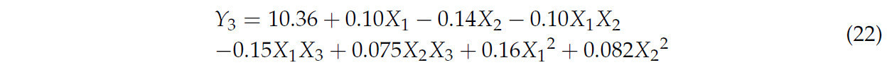 В уравнении, Y3 представляет коэффициент вариации для высоты среза, X1 представляет кодированное значение для скорости движения вперед, X2 представляет кодированное значение для скорости среза, а X3 — кодированное значение для коэффициента скорости конвейера.