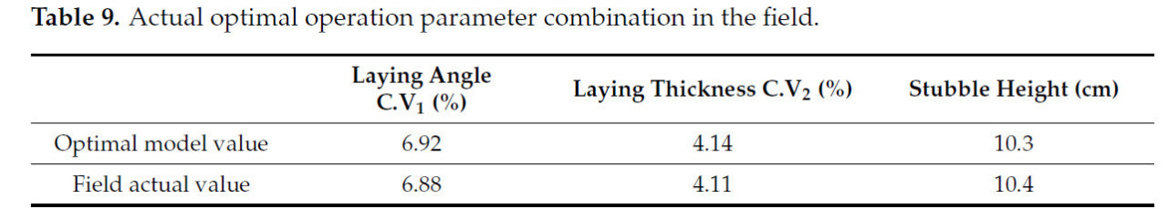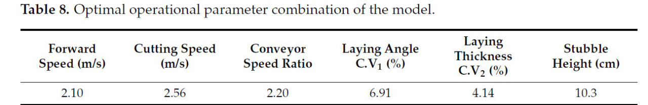 Использование Design-Expert 8.0.6 для оптимизации результатов ортогонального эксперимента, диапазоны параметров были установлены следующим образом: скорость движения вперед 2,1–2,5 м/с, скорость среза 2,3–2,7 м/с и коэффициент скорости конвейера 2,1–2,5. Коэффициенты вариации угла посадки и толщины контролировались в пределах 0–10,83% и 0–6,75% соответственно, в то время как высота среза была установлена между 10 и 10,9 см. Результаты оптимальной комбинации рабочих параметров показаны в Таблице 8.