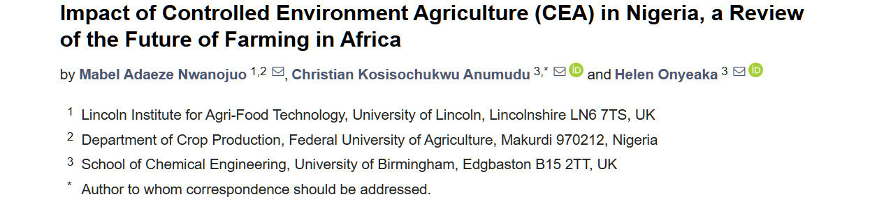 Nwanojuo MA, Anumudu CK, Onyeaka H. Impact of Controlled Environment Agriculture (CEA) in Nigeria, a Review of the Future of Farming in Africa. Agriculture. 2025; 15(2):117. https://doi.org/10.3390/agriculture15020117