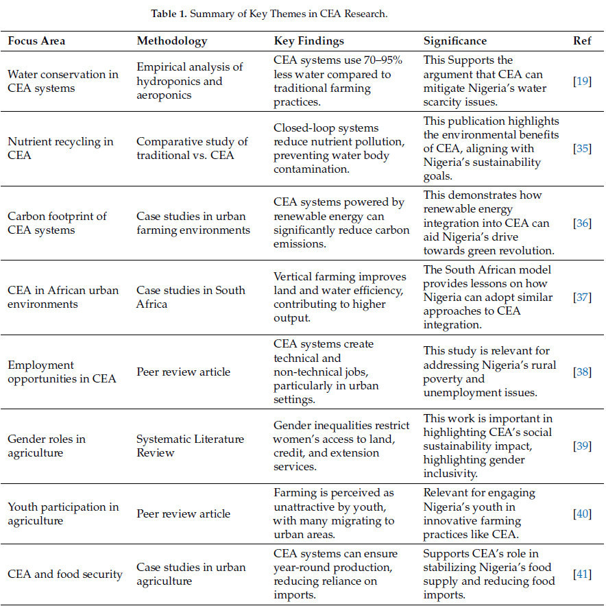 В исследовании использовались как количественные, так и качественные методологии для всестороннего понимания жизнеспособности CEA в Нигерии. Был принят смешанный метод дизайна с целью охватить технические, стоимостные и социально-экономические факторы при оценке осуществимости CEA. Исследовательский подход, использованный в данном исследовании, включает проведение обзора литературы и исследование конкретных случаев. За этим следует анализ существующей литературы для предоставления логической теоретической основы для исследования, с акцентом на основные области CEA в Нигерии и Африке, которые включают экономию воды, минимальное использование земли и общие экологические соображения. Уделялось внимание использованию CEA в странах с климатическими условиями, близкими к климату Нигерии, оценивая экономические и социальные последствия CEA для продовольственной безопасности и сельскохозяйственной производительности. В Таблице 1 представлена некоторая информация о недавних результатах исследований, ключевых темах в этой исследовательской сфере и ключевых выводах.
