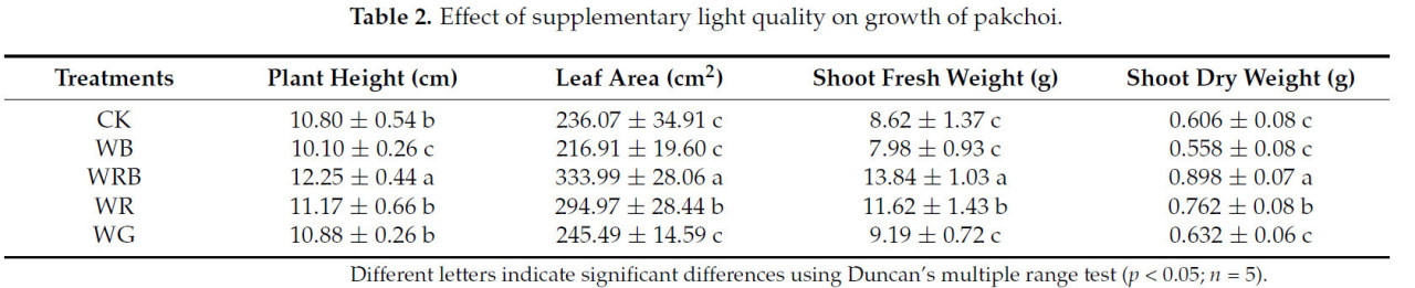 Таблица 2. Влияние дополнительного качества света на рост пак-чоя.
