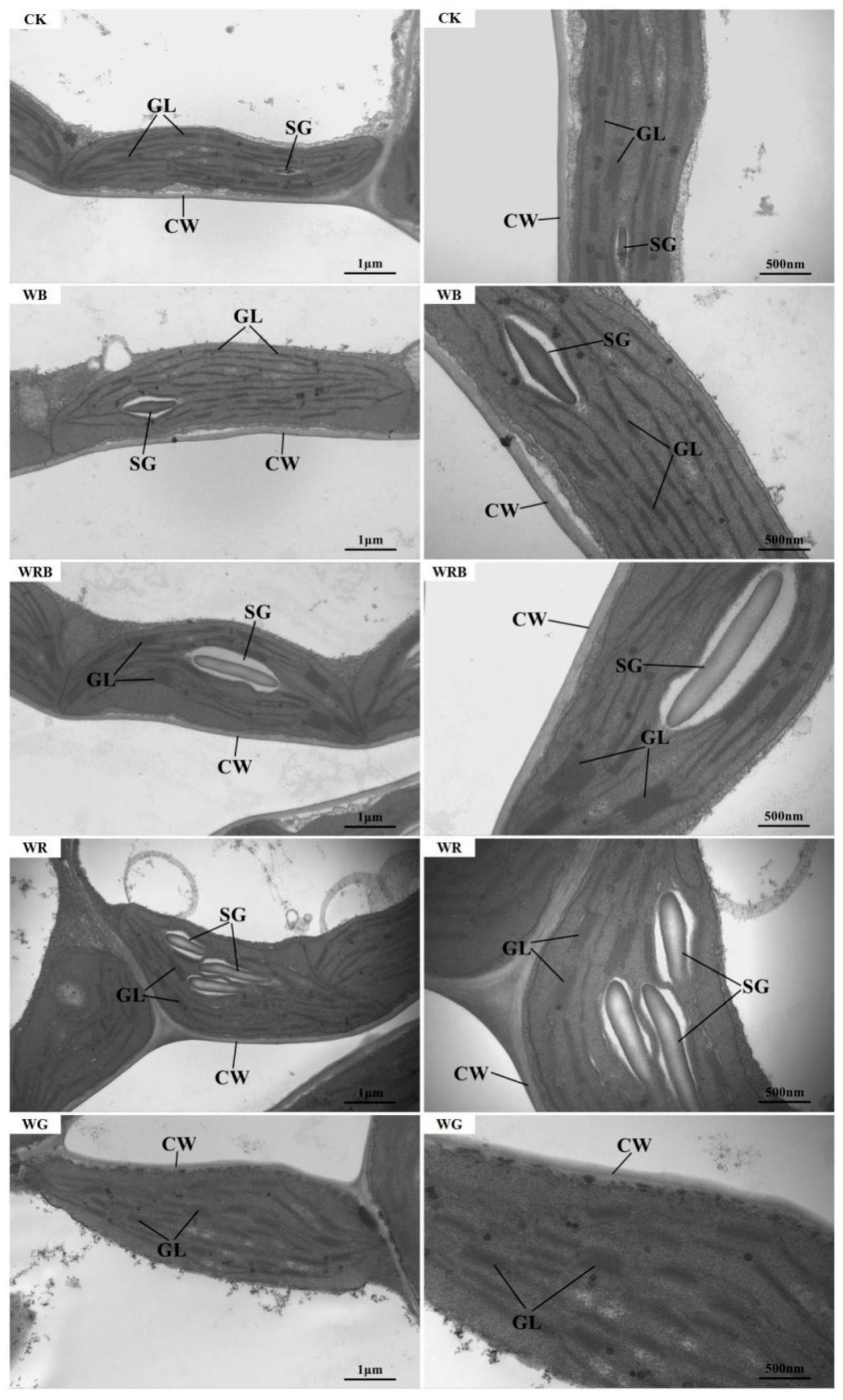 Рисунок 2. Влияние дополнительного качества света на ультраструктуру хлоропластов листьев пак-чоя. Левая сторона увеличена в 2500 раз, правая сторона увеличена в 5000 раз. CW: клеточная стенка; SG: крахмальное зерно; GL: гранальная ламелла.
