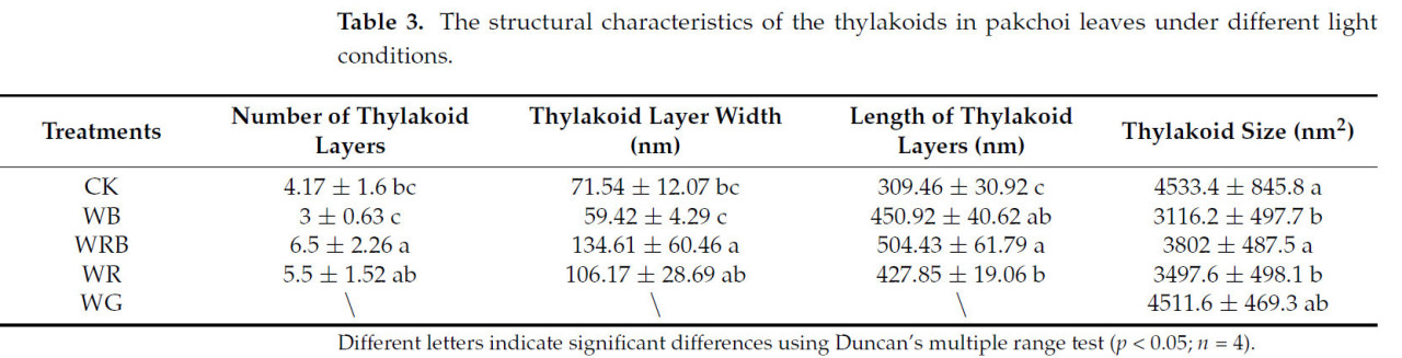 Результаты показали существенные различия в показателях роста, питательном качестве, активности ферментов и других параметрах в зависимости от качества света. Наилучшие результаты роста наблюдались при варианте освещения WRB. Хлоропласты растений под светом WRB были хорошо развиты, с четкими гранальными ламеллами. Тилакоиды в гранах хлоропластов растений WRB были плотно уложены, также было обнаружено большое количество крахмальных зерен.