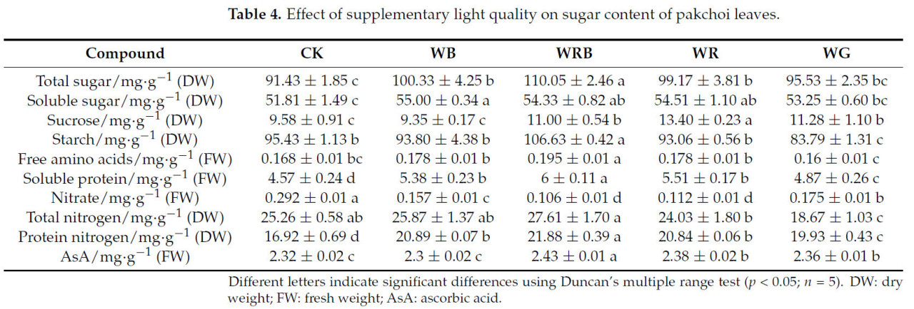 Таблица 4. Влияние дополнительного качества света на содержание сахара в листьях пак-чоя.