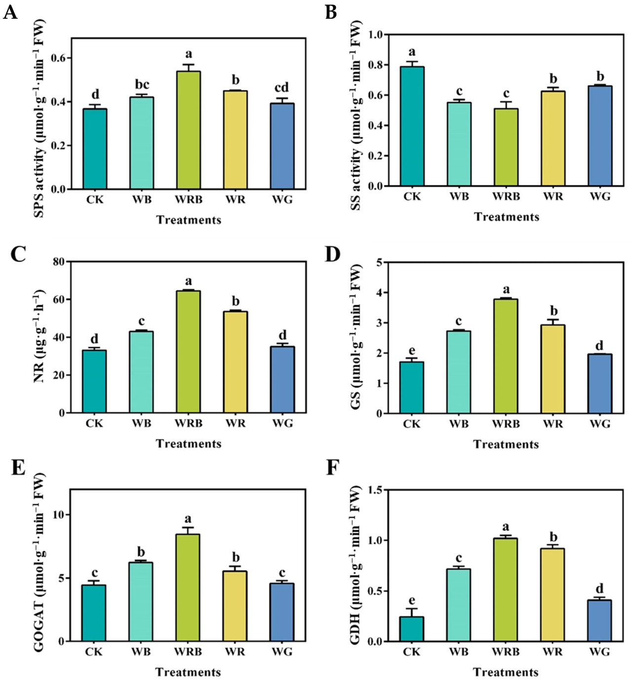 Активность SPS была на 46,9%, 22,3% и 14,7% выше при обработках WRB, WR и WB соответственно, по сравнению с CK (Рисунок 3А). Не было значимой разницы между обработками WG и CK. Дополнительно, активность SPS была значительно выше при обработке WRB, чем в других группах обработки. Напротив, активность SS была значительно снижена во всех обработках по сравнению с CK, причем обработки WRB и WB показали наименьшую активность (Рисунок 3B). Наивысшая активность нитратредуктазы (NR) наблюдалась в группе обработки WRB, с увеличением на 94%, 61,9% и 29,9% по сравнению с CK при обработках WRB, WR и WB соответственно. Не было значимой разницы между обработками WG и CK (Рисунок 3C). Активность глутаминсинтетазы (GS) следовала порядку WRB > WR > WB > WG > CK (Рисунок 3D). Активность глутаматсинтетазы (GOGAT) была значительно выше при обработке WRB, чем при других обработках (Рисунок 3E). Не было значимой разницы между обработками WR и WB, обе из которых были значительно выше, чем CK, в то время как разница между WG и CK не была значимой. Наивысшая активность глутаматдегидрогеназы (GDH) наблюдалась при обработке WRB, за которой следовала WR, в то время как контрольная обработка (CK) показала значительно более низкую активность по сравнению с другими обработками (Рисунок 3F).