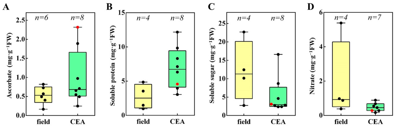 Рисунок 4. Качество пак-чоя, выращенного в различных условиях. Красные точки указывают на содержание показателей качества в этом исследовании. Черные точки указывают на содержание показателей качества в предыдущих исследованиях. Field: пак-чой, выращенный в поле; CEA: пак-чой, выращенный в условиях контролируемого сельского хозяйства (controlled environmental agriculture); (A) Содержание аскорбата; (B) Содержание растворимого белка; (C) Содержание растворимого сахара; (D) Содержание нитратов.