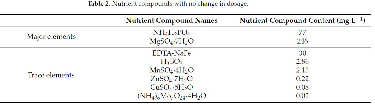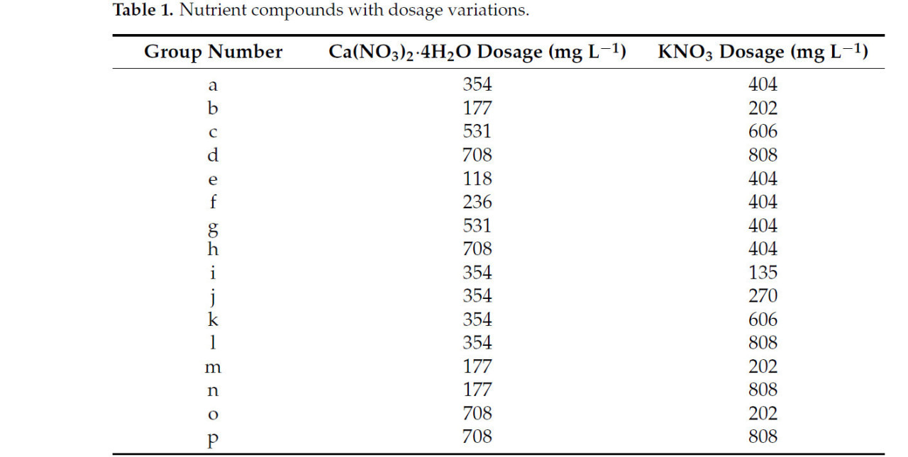 Формула питательного раствора для томатов Ямасаки была разработана в соответствии с потребностями растений в воде и удобрениях и считается стабильным питательным раствором. Питательный раствор, используемый в градиентном тесте, был составлен в соответствии с формулой питательного раствора для томатов Ямасаки, а дозировки питательных соединений с вариациями показаны в таблице 1. Дозировки питательных соединений без вариаций показаны в таблице 2, а микроэлементы были составлены по общей формуле.