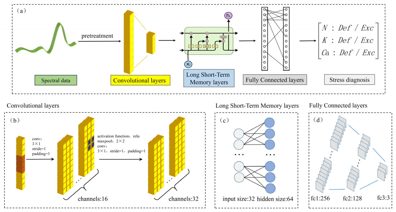 Спектральная поглощательная способность листа томата содержит множество физиологических и биохимических характеристик. Чтобы полностью извлечь детальные характеристики, встроенные в кривую спектральной поглощательной способности, в качестве модуля обработки входных данных используется CNN для извлечения признаков из предварительно обработанной кривой спектральной поглощательной способности. Учитывая существование временных признаков среди спектральных данных, собранных на протяжении всего экспериментального цикла, в качестве модуля постобработки используется сеть LSTM. Как показано на рисунке 2a, модель глубокого обучения принимает спектральный коэффициент поглощения кроны томата в качестве входных данных и статус стресса N, K и Ca в качестве выходных данных.