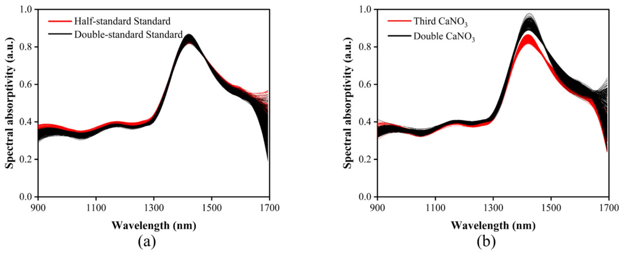 Спектральная поглощательная способность листьев кроны томата раскрывает богатые детали о состоянии роста. Как показано на рисунках 4a и 4b, были сравнены два набора кривых поглощения спектра (900–1700 нм) кроны томата, предварительно обработанные при различных практиках управления питанием. Как показано на рисунке 4a, кривые спектрального поглощения при половинной стандартной дозе питательных веществ и двойной стандартной дозе питательных веществ значительно различались в двух интервалах полос: 900–1300 нм и 1600–1700 нм. Томаты при половинном управлении питанием показали значительно большую спектральную поглощательную способность в этой полосе. Как показано на рисунке 4b, кривые спектрального поглощения при одной трети стандартной дозы CaNO₃ и двойной стандартной дозе CaNO₃ различались в интервале полос 1400–1550 нм, и томаты при управлении одной третью стандартной дозы CaNO₃ имели значительно более низкую спектральную поглощательную способность в этой полосе. Таким образом, хотя тенденции в спектральной поглощательной способности были схожи для всех листьев кроны томата, кривые спектрального поглощения при различных уровнях управления питанием все еще значительно различались, в частности, в подразделенных интервалах полос, что свидетельствует о возможности использования спектроскопии для диагностики стрессовых условий от недостатка питательных веществ у томатов.