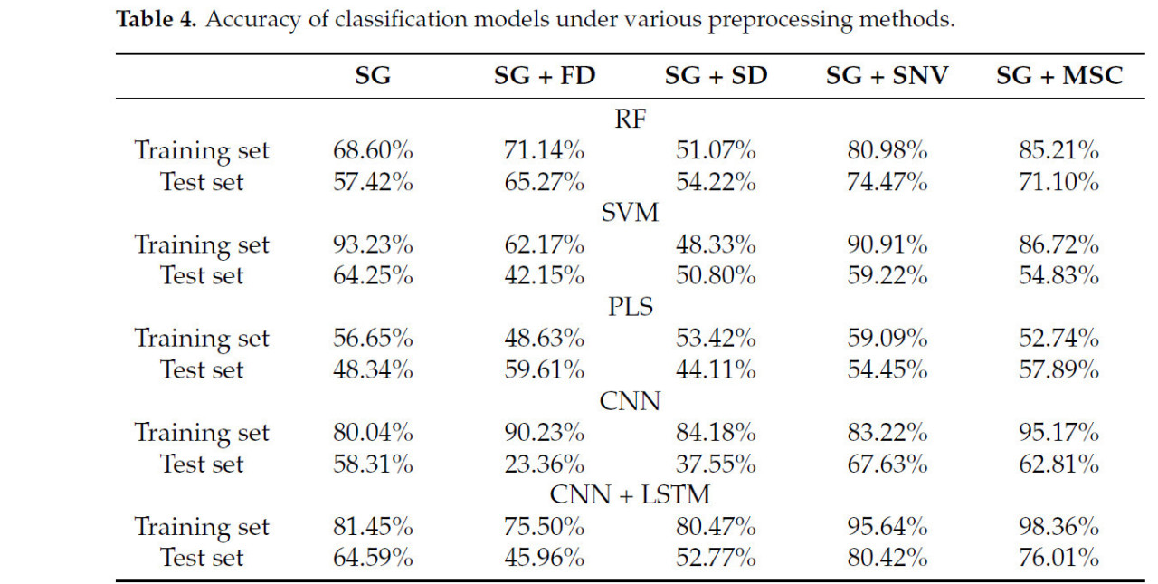 Как показано в таблице 1, все экспериментальные группы были разделены на категории: дефицит N, избыток N, дефицит K, избыток K, дефицит Ca и избыток Ca. Методы предварительной обработки SG, FD, SD, SNV и MSC были объединены для сравнения показателей точности прогнозирования каждой модели при различных стратегиях предварительной обработки данных, результаты представлены в таблице 4. Результаты показывают, что наивысший средний показатель точности для обучающей выборки был достигнут при комбинации SG + MSC, давшей среднюю точность 83,64%. Аналогично, наивысший средний показатель точности для тестовой выборки был достигнут при комбинации SG + SNV, со средней точностью 67,24%. Показатели точности для других трех методов предварительной обработки были сравнительно ниже. Однако кумулятивная разница в показателях точности между обучающей и тестовой выборками для комбинации SG + MSC была на 32,21% выше, чем для комбинации SG + SNV. Большое расхождение в точности между обучающей и тестовой выборками часто указывает на переобучение. Поэтому был выбран метод предварительной обработки спектров SG + SNV.