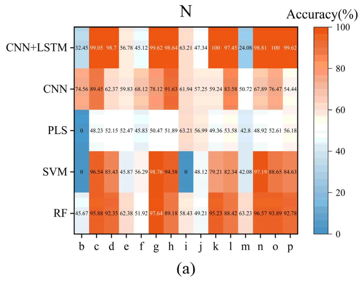 Чтобы исключить ошибочные суждения, вызванные неподходящими начальными настройками параметров в моделях, это исследование сначала разработало задачу классификации для всех экспериментальных групп (a~p) (16-классовая классификация) и предварительно настроило параметры каждой модели. Матрицы ошибок для результатов классификации каждой модели показаны на рисунке 3. Модели SVM, CNN и CNN + LSTM продемонстрировали хорошую классификационную производительность с общей точностью 94,83%, 92,81% и 96,01% соответственно. Среди них модель CNN показала значительную ошибку классификации в группе g, где большинство тестовых образцов g были ошибочно классифицированы как группа h, что свидетельствует о возможном переобучении модели. Хотя модель RF имела общую точность всего 71,1%, неправильно классифицированные образцы были более рассеяны, без какой-либо концентрированной ошибки классификации. Кроме того, поскольку PLS почти полностью провалился в этой многоклассовой задаче, окончательная матрица ошибок для PLS не представлена. В качестве альтернативы параметры PLS были предварительно настроены на основе задач бинарной классификации для любых двух групп. Окончательные параметры для каждой модели показаны в таблице 3.