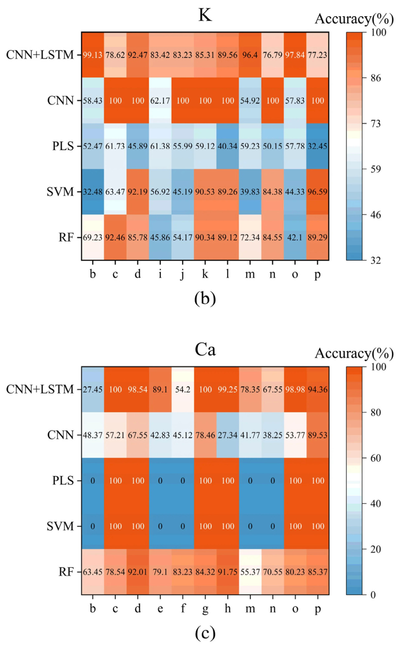 На основании результатов раздела 3.2 представлены показатели точности для диагностики стресса N, K и Ca при предварительной обработке SG + SNV для каждой модели, общие результаты показаны в таблице 5. Подробные диагностические результаты для каждой группы проиллюстрированы на рисунке 5. Среди них модель SVM не достигла точности выше 50% в диагностике дефицита питательных веществ для любого из трех элементов, в то время как точность диагностики избытка питательных веществ для всех трех элементов превысила 86%, что явно указывает на сильное переобучение. Модель PLS, за исключением диагностики избытка Ca, достигла показателей точности ниже 60% для других диагнозов стресса. Таким образом, SVM и PLS считаются практически полностью провалившимися. Модель CNN достигла точности выше 60% в диагностике стресса для N, K и Ca в пяти сценариях. Однако в четырех из этих сценариев точность не превысила 75%. Как показано на рисунке 5b, модель CNN также демонстрирует значительное переобучение в диагностике K. Учитывая, что это задача бинарной классификации, модель CNN также считается неэффективной. Модель RF показала диагностическую точность выше 70% в четырех сценариях, причем в трех из них превышающую 85%. Более того, как показано на рисунках 5a и 5b, модель RF достигла точности выше 50% в диагностике дефицита N и дефицита K, что свидетельствует о том, что ее более низкая производительность в этих двух категориях связана с внутренними сложностями задачи, а не с переобучением. Модель CNN + LSTM показала превосходные результаты в четырех сценариях с диагностической точностью выше 83%. Подобно модели RF, модель CNN + LSTM не показывает значительного переобучения.