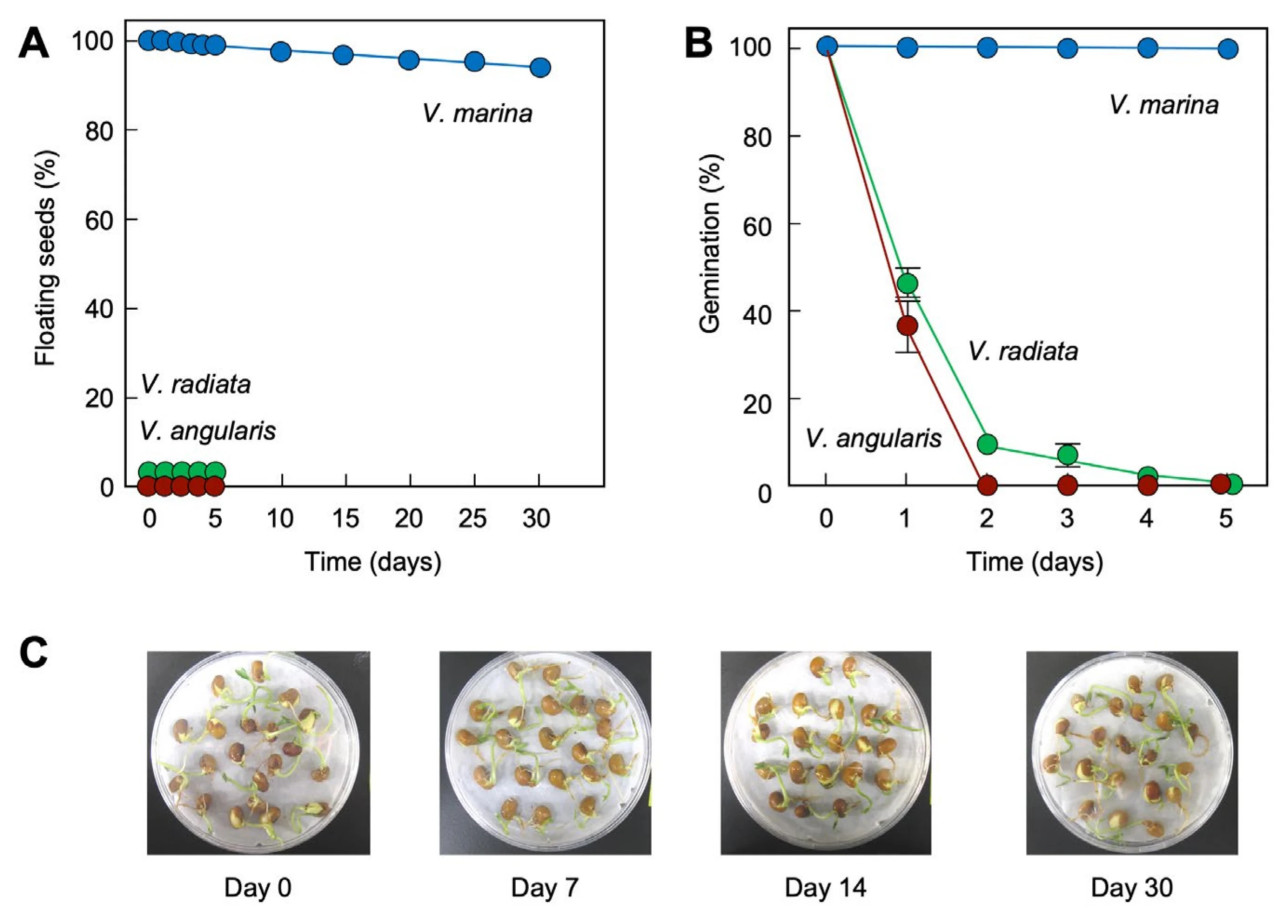 V. marina — это пантропическое прибрежное растение, известное своей способностью к расселению морем [31]. Примечательно, что зарегистрировано, что семена V. marina могут плавать в соленой воде до 25 лет, сохраняя способность к прорастанию [25]. На Рисунке 2 сравнивается устойчивость семян трех видов Vigna к морской воде: V. marina, V. radiata и V. angularis. Хотя их морфология и размер схожи (Рисунок 2A), существует значительная разница в воздушном пространстве внутри семян. Семена V. marina, заключенные в толстую семенную оболочку, образуют большую центральную полость (Рисунок 2B). Большое воздушное пространство, вероятно, способствует плавучести семян V. marina в морской воде (Рисунок 2C). В отличие от этого, семена V. radiata и V. angularis не обладают плавучестью и сразу же опускались на дно резервуара с морской водой (Рисунок 2D,E).
