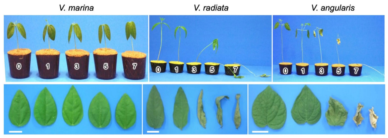 Vigna marina, называемая дикой береговой фасолью [23], береговым коровьим горохом [24] или дюнной фасолью [25], естественным образом произрастает в прибрежных районах тропических и субтропических регионов Пацифики [25] и Африки [26]. Ее естественная среда обитания в зонах, омываемых морем, сделала высокую солеустойчивость V. marina темой значительного интереса в исследованиях растений. В лабораторных исследованиях солеустойчивость V. marina в основном оценивали с использованием растворов NaCl. Однако ее устойчивость к морской воде — ключевой аспект базовых знаний для практического применения — еще не была продемонстрирована экспериментально. Это исследование направлено на то, чтобы наглядно показать выдающуюся устойчивость V. marina к морской воде путем проведения сравнительных экспериментов бок о бок с V. radiata и V. angularis в качестве контрольных видов с отрицательной реакцией. Полученные данные устанавливают V. marina как высокоустойчивый к морской воде вид Vigna, позиционируя его как перспективного кандидата для решения проблем производства сельскохозяйственных культур, вызванных засолением почв в результате вторжения морской воды на сельскохозяйственные земли.