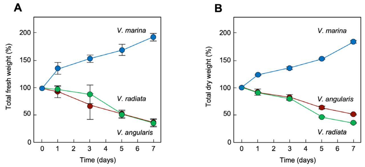 Рисунок 5. Изменения сырой и сухой массы проростков трех видов Vigna во время обработки морской водой. (A) Изменения общей сырой массы. (B) Изменения общей сухой массы. Столбики представляют стандартное отклонение (SD), n = 3.