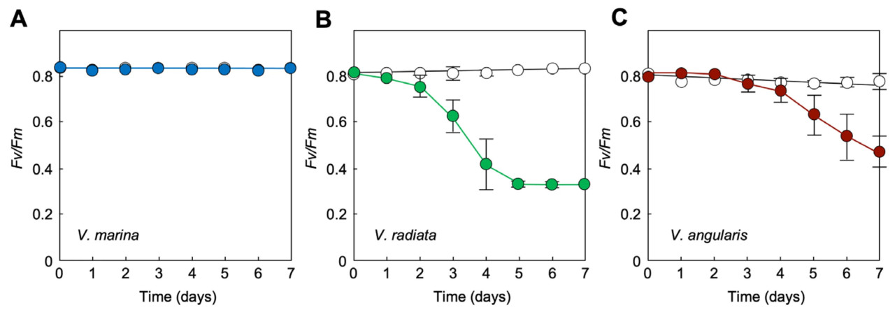 Рисунок 6. Влияние обработки морской водой на фотосинтетическую активность трех видов Vigna. (A) Изменения значений Fv/Fm у V. marina. (B) Изменения значений Fv/Fm у V. radiata. (C) Изменения значений Fv/Fm у V. angularis. Белые открытые кружки обозначают значения Fv/Fm листьев проростков, политых дистиллированной водой. Цветные закрашенные кружки представляют значения проростков, подвергшихся обработке морской водой. В целом, значение Fv/Fm около 0,8 служит критерием неповрежденного фотосинтеза. Снижение Fv/Fm предполагает ингибирование или нарушение фотосинтеза. Столбики представляют SD (n = 3).