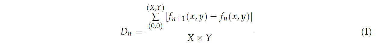 где (X, Y) относится к ширине и высоте кадра, f(x, y) представляет значение цвета точки пикселя с координатами (x, y), n — порядковый номер видеокадра, а D — межкадровая разность.