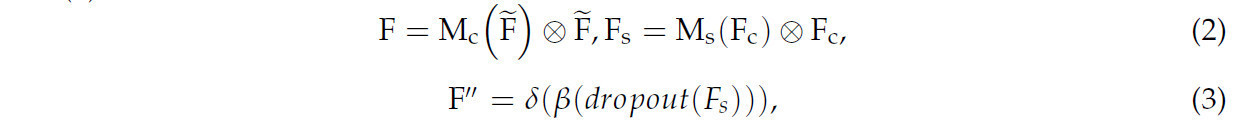 где ⊗ — поэлементное умножение, F_c и F_s — тензор признаков после канального и пространственного отбора соответственно, δ(⋅) и β(⋅) — операции выпрямленного линейного блока и пакетной нормализации соответственно, а F^″ — окончательный выход.