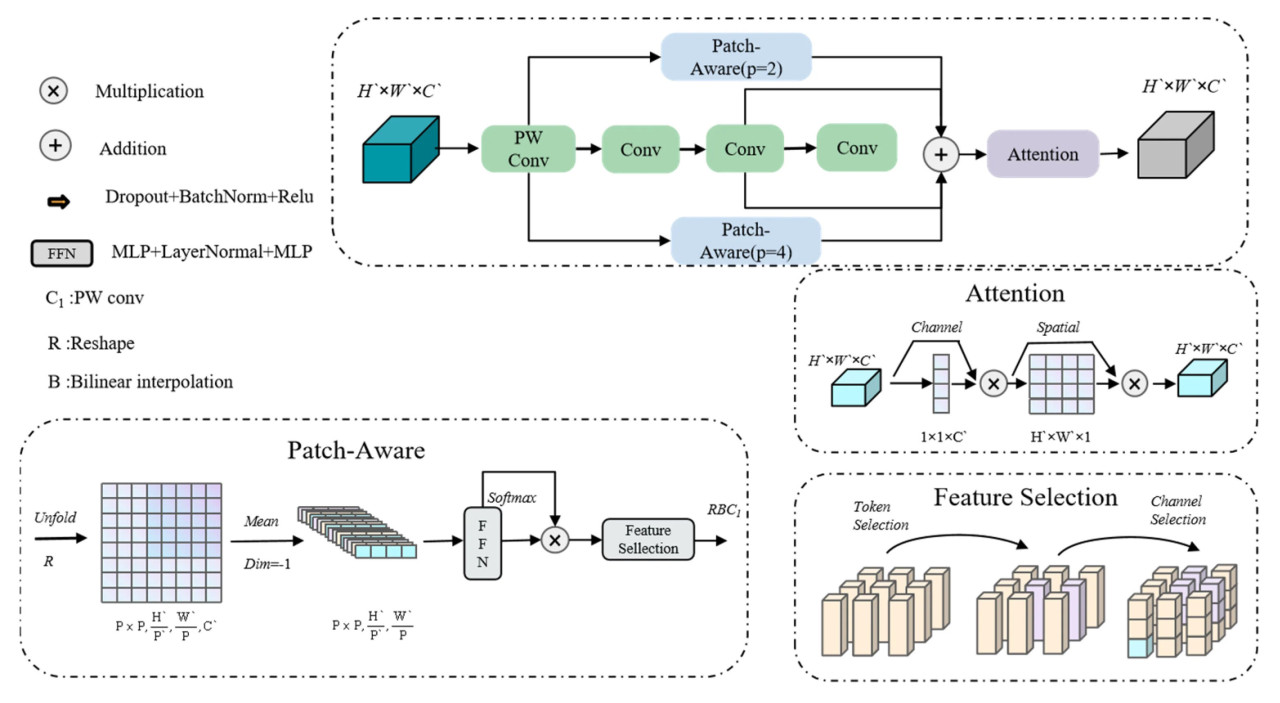 Параллельный модуль внимания с учетом патчей (PPA) был впервые предложен в задачах обнаружения мелких объектов в инфракрасном диапазоне [22], где использовалась стратегия параллельных многоканальных ветвей для повышения точности обнаружения мелких объектов. Как показано на рисунке 2, модуль PPA включает три параллельные ветви: локальную, глобальную и ветвь последовательной свертки. Входной тензор признаков F∈R^(H^'×W^'×C) сначала корректировался посредством поточечной свертки для получения F^'∈R^(H^'×W^'×C^' ), а затем обрабатывался через каждую из трех параллельных ветвей для получения трех различных тензоров признаков: F_local∈R^(H^'×W^'×C^' ), F_global∈R^(H^'×W^'×C^' ) и F_conv∈R^(H^'×W^'×C^' ). Наконец, выходы трех ветвей суммировались для получения входа механизмов внимания, F ̃∈R^(H^'×W^'×C^' ). В частности, различающая ветвь управляется параметром размера патча p, который агрегирует и смещает неперекрывающиеся патчи карт признаков в пространственных измерениях и вычисляет матрицу внимания между неперекрывающимися патчами, чтобы обеспечить извлечение и взаимодействие локальных и глобальных признаков. В модуле механизма внимания тензор признаков последовательно обрабатывался через одномерную карту внимания признаков и двумерную карту внимания признаков для получения окончательного выхода. Процесс можно обобщить как уравнения (2) и (3):