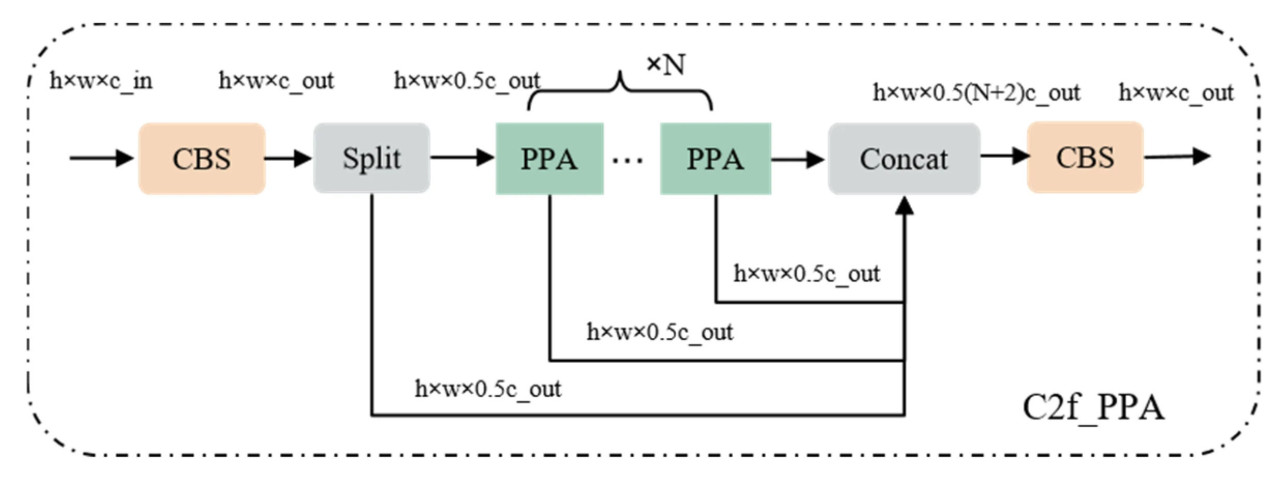На рисунке 3 показана архитектура модуля C2f_PPA. Чтобы повысить способность модели извлекать информацию изображения, модуль PPA использовался для замены узкого места внутри модуля C2f. Следовательно, все слои C2f (2, 4, 6 и 8) в базовой сети были заменены модулем C2f_PPA.
