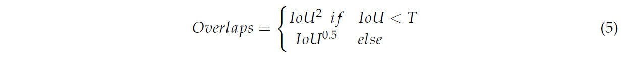 Вдохновленные этим, чтобы сделать качество сопоставления и веса потерь для различных пар прогноз-GT более различимыми, мы оптимизировали функцию расчета перекрытия (overlaps) в процессе вычисления метрики выравнивания с использованием пользовательской степенной функции преобразования (PT). Эта функция могла бы дальнейшее усилить вес высококачественных прогнозируемых рамок, одновременно подавляя влияние рамок низкого качества. Функция выражается следующим образом: