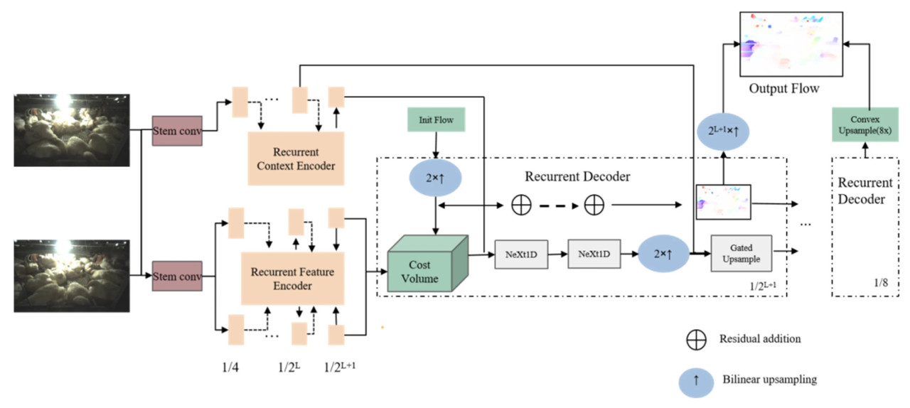 Оценка оптического потока описывает движение точек пикселей в последовательности изображений и может предоставлять информацию, такую как траектории движения и скорости объектов. В видео бройлеров активность бройлеров за определенный период времени может быть оценена с помощью оценки оптического потока серии ключевых кадров. Традиционные методы оценки оптического потока хорошо работают в простых сценах и при обработке малых движений, но не подходят для работы со сложными сценами и крупномасштабными движениями. Различное поведение бройлеров и неравномерное распределение света в клетке создают сложную сцену, требующую более совершенного аналитического подхода.