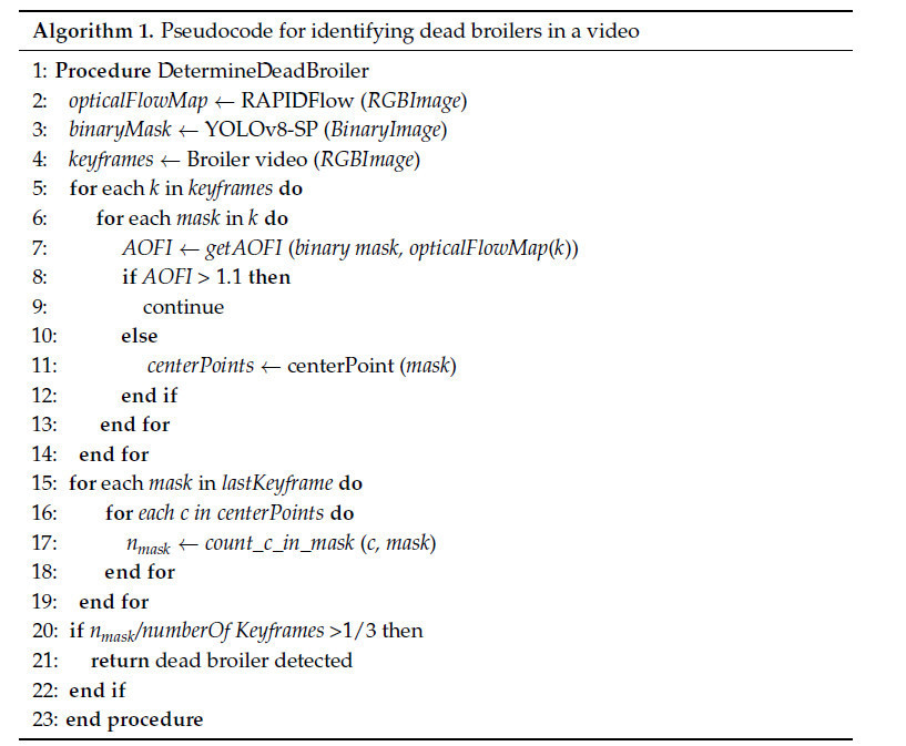Во-первых, для захвата ключевых кадров в видео использовался метод разностных кадров. Затем была разработана усовершенствованная сегментационная сеть YOLOv8-SP для получения координат маски каждого бройлера, а также применен метод оценки оптического потока для генерации карт оптического потока и оценки их движения. Для оценки уровня движения каждого бройлера в каждом ключевом кадре был определен и рассчитан индекс средней интенсивности оптического потока (AOFI). С помощью порогового значения AOFI бройлеры на ключевых кадрах были классифицированы как потенциально павшие и активные живые особи. В конечном счете, идентификация павших бройлеров была достигнута путем анализа частоты, с которой каждая особь определялась как потенциально павшая на всех ключевых кадрах видео.