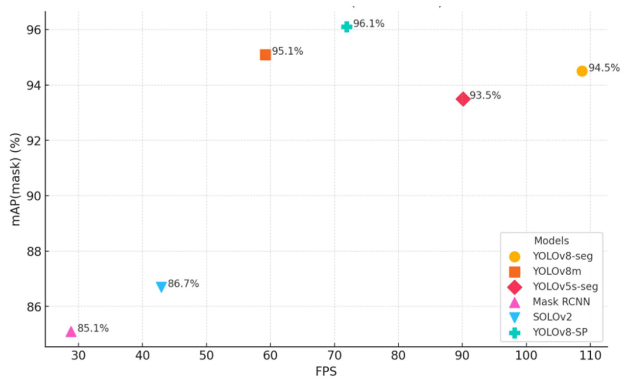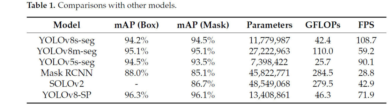 Производительность различных моделей на наборах данных для сегментации бройлеров, созданных в этом исследовании, показана в таблице 1 и на рисунке 7. Чтобы обеспечить справедливое сравнение, ни одна из моделей не использовала предварительно обученные веса во время обучения. Среди всех моделей YOLOv8-SP достигла наивысшей точности обнаружения с mAP 96,1% для рамок и 96,3% для масок. По сравнению с YOLOv8s-seg, YOLOv8-SP улучшила mAP (рамка) и mAP (маска) на 1,9% и 1,8% соответственно, в то время как количество параметров увеличилось только на 13,8%, вычислительные затраты возросли на 4,5%, а скорость вывода снизилась на 36,8 кадров в секунду. Эти увеличения параметров и вычислений считаются приемлемыми. По сравнению с YOLOv8m-seg наша модель улучшила mAP (рамка) и mAP (маска) на 1,2% и 1,0% соответственно, в то время как количество параметров и вычислительные затраты были сокращены примерно на 51% и 58% соответственно, с увеличением скорости вывода на 12,7 кадров в секунду. По сравнению с YOLOv5s-seg, хотя YOLOv8-SP не превосходила по количеству параметров и вычислениям, ее скорость вывода была аналогичной, в то время как mAP (рамка) и mAP (маска) показали значительные улучшения на 1,8% и 2,6% соответственно. По сравнению с двухэтапными моделями, SOLOv2 [27] и Mask R-CNN [28], YOLOv8-SP продемонстрировала существенные улучшения как в точности обнаружения, так и в скорости вывода.