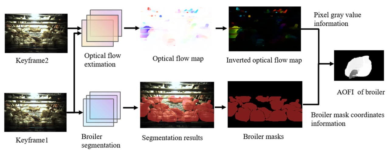 Целью данного исследования было использование видеометода для идентификации павших бройлеров в птичьих стадах. Схема предложенного метода изображена на рисунке 1. Сначала из видео бройлеров с помощью метода межкадрового максимума извлекались ключевые кадры. Затем мы использовали пороговое значение средней интенсивности оптического потока (AOFI) для оценки движения бройлеров в каждом ключевом кадре и классифицировали бройлеров на активных и кандидатов в павшие. Значение AOFI было определено на основе оценки оптического потока и сегментации маски бройлера. Наконец, мы подсчитали частоту, с которой каждый бройлер определялся как кандидат в павшие на всех ключевых кадрах, и сделали окончательное определение павших бройлеров на основе порогового метода.