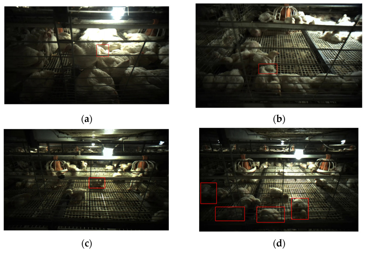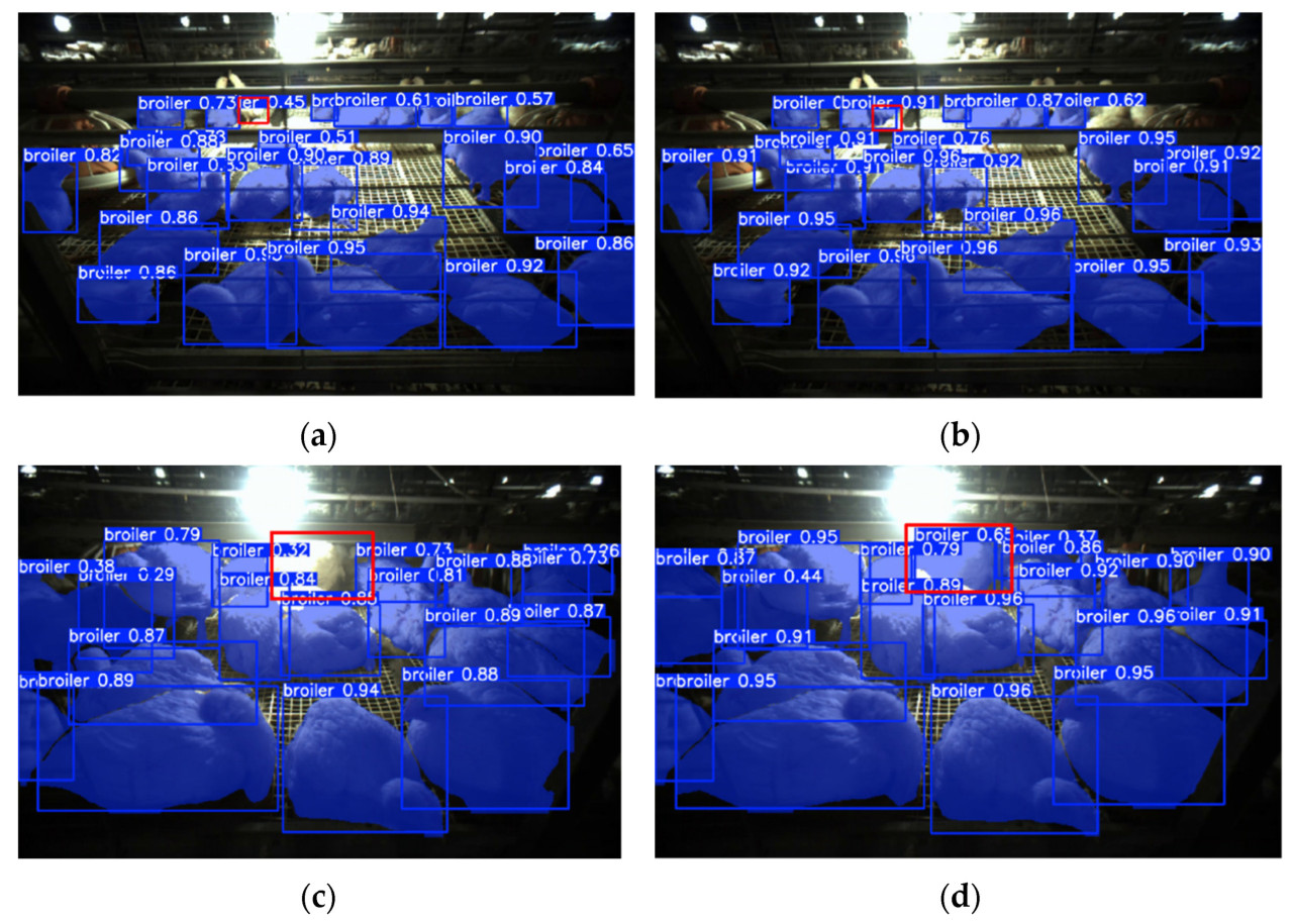 Рисунок 12. Примеры ошибочно идентифицированных бройлеров. (a,b) Павшие бройлеры были отмечены красными прямоугольными рамками. (c,d) Живой бройлер, загороженный водопроводной линией, и бройлер в состоянии сна были отмечены красными прямоугольными рамками соответственно.
