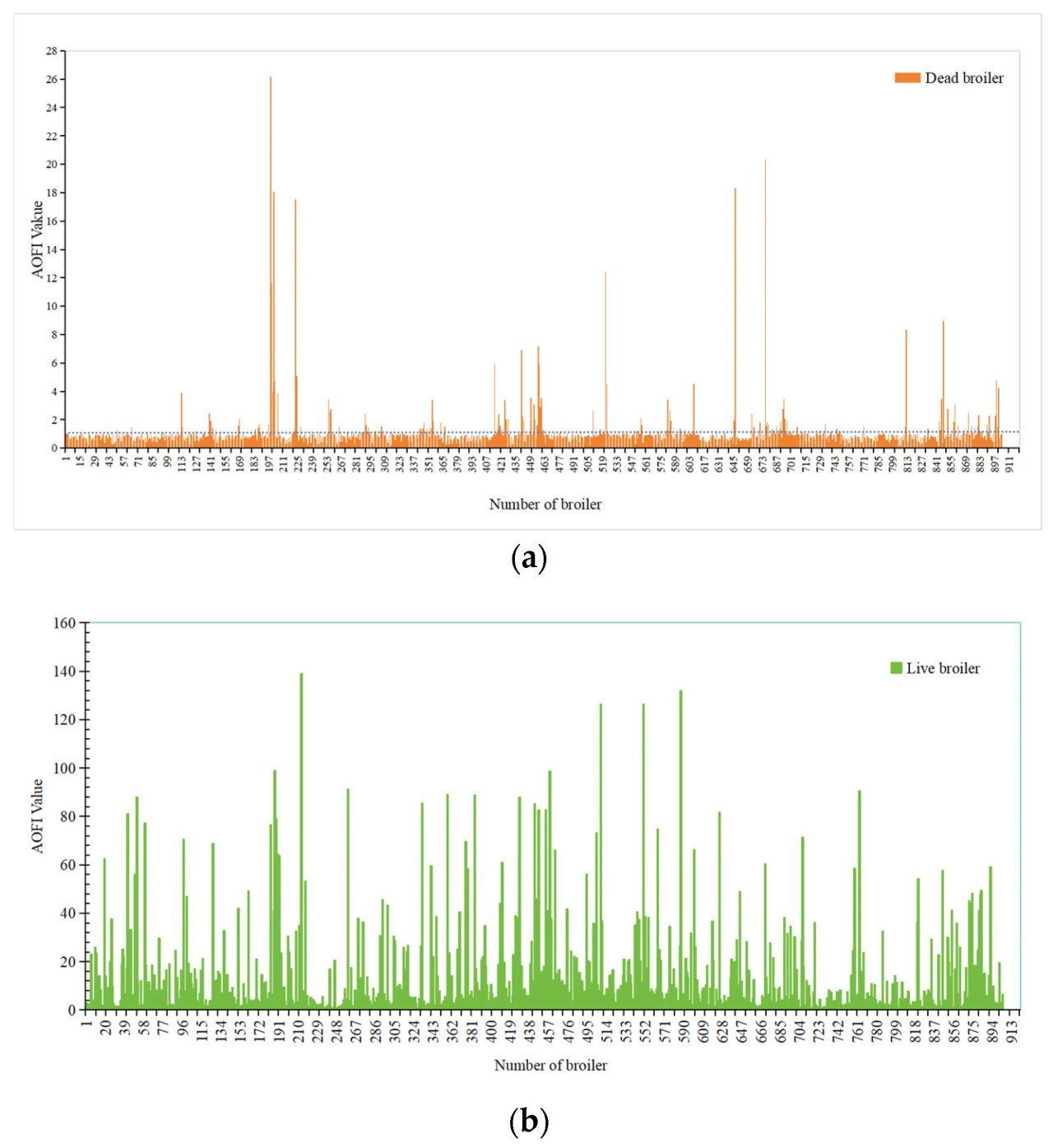 Оптимальный порог для AOFI должен минимизировать вероятность идентификации живых бройлеров в ключевых кадрах как кандидатов в павшие, одновременно обеспечивая идентификацию фактических павших бройлеров как таковых. Поэтому из каждой недели с третьей по шестую случайным образом были выбраны четыре видеоролика, содержащих павших бройлеров, в результате чего получилось в общей сложности шестнадцать видеороликов. Из видеоклипов были извлечены ключевые кадры, содержащие павших и живых бройлеров, для анализа. Всего было подсчитано 904 павших бройлера и 904 живых бройлера, и их значения AOFI были записаны. На рисунке 10 представлено распределение значений AOFI для 904 живых бройлеров и 904 павших бройлеров. Как показано на рисунке 10а, значения AOFI павших бройлеров были сосредоточены около 1,0, в диапазоне от минимального значения 0,01 до максимального значения 26,70. Напротив, значения AOFI живых бройлеров, показанные на рисунке 10b, были более дисперсными, в основном в диапазоне от 0 до 20, с минимальным значением 0 и максимальным значением 138,89.