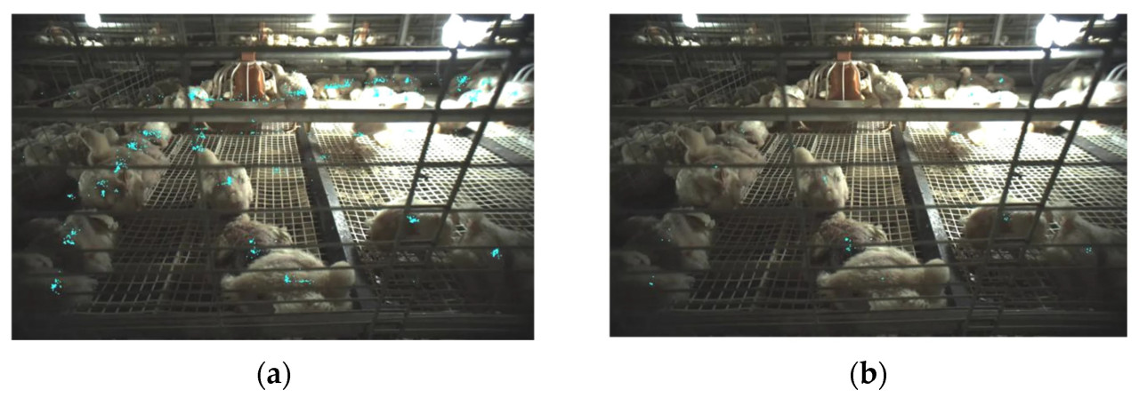 При использовании порога AOFI для идентификации кандидатов в павшие бройлеры в ключевых кадрах кандидаты в павшие бройлеры обычно состояли как из живых, так и из павших бройлеров. Причины ошибочной идентификации живых бройлеров как кандидатов в павшие в ключевых кадрах можно разделить на два типа. Во-первых, если бройлер вообще не двигался в интервале между двумя соседними ключевыми кадрами, его значение AOFI было бы почти нулевым, поэтому он идентифицировался как кандидат в павшие. Во-вторых, если движение бройлера было минимальным или медленным, что не могло быть обнаружено алгоритмом оптического потока, в результате чего значение AOFI оказывалось ниже порога, он идентифицировался как кандидат в павшие. Первый сценарий был неизбежен, потому что на бройлерной ферме движение бройлеров в клетках было случайным и неконтролируемым. Ключевые кадры не могли всегда захватывать движение всех бройлеров одновременно. Съемка видео в периоды, когда бройлеры были активны, могла бы снизить такие случаи. Второй сценарий часто происходил с бройлерами, находящимися дальше от камеры, из-за эффектов перспективы и углов съемки, что вызывало слишком маленькие движения, чтобы быть обнаруженными алгоритмом оптического потока. Эти удаленные бройлеры прямо исключались алгоритмом при идентификации кандидатов в павшие бройлеры. Кроме того, бройлеры, близкие к камере, с минимальными движениями также не обнаруживались алгоритмом оптического потока. Эта проблема постепенно улучшалась по мере взросления бройлеров. По мере того как бройлеры становились старше и крупнее, движения тела, вызванные их дыханием, могли быть обнаружены алгоритмом оптического потока, что снижало ошибочную идентификацию живых бройлеров как кандидатов в павшие. Чтобы смягчить второй сценарий, можно либо выбрать подходящее время для захвата видео, либо повысить чувствительность алгоритма оптического потока.