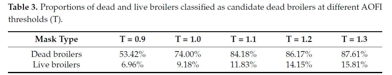 Таблица 3. Доли павших и живых бройлеров, классифицированных как кандидаты в павшие при разных порогах AOFI (T).