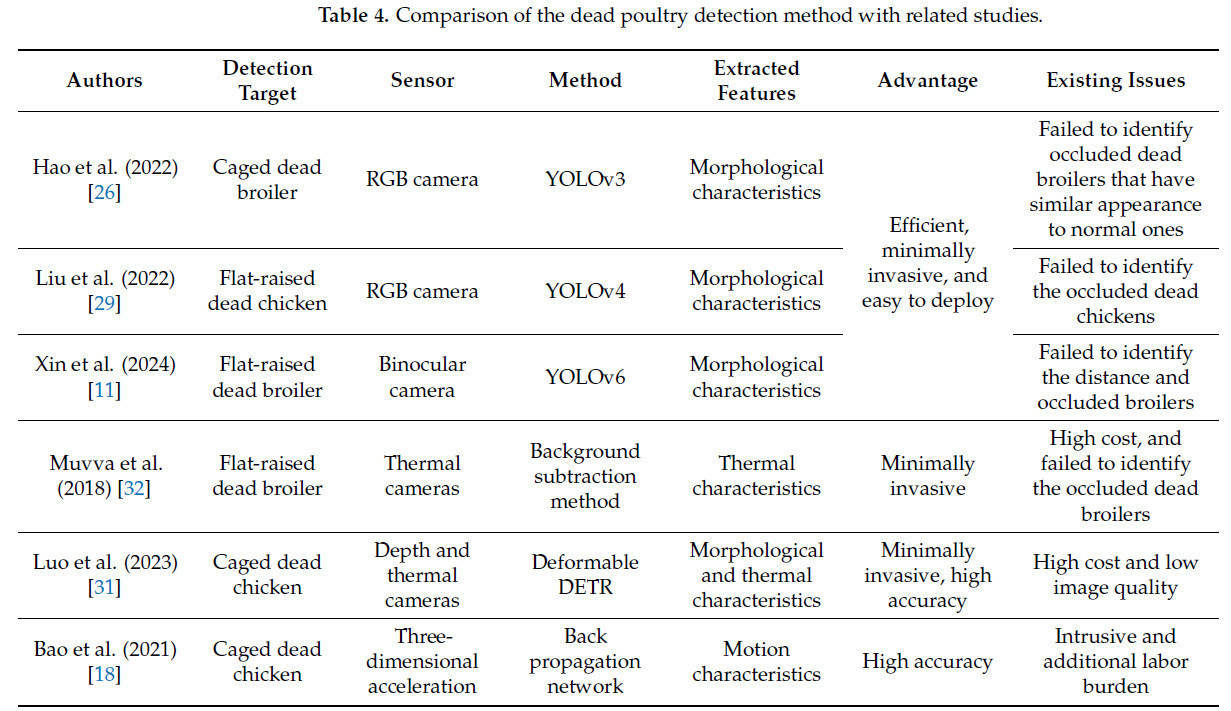 Идентификация павших бройлеров традиционно осуществлялась путем визуального наблюдения, что является весьма трудоемким и затратным по времени методом. Этот метод подвергает работников рискам для здоровья и безопасности, особенно на крупных птицефабриках. Появление точного животноводства (PLF) в сочетании с растущим дефицитом рабочей силы в птицеводстве подчеркнуло настоятельную необходимость в автоматизированных системах для успешного мониторинга и управления здоровьем птицы. В ответ на эту потребность исследователи предложили различные методы, включая технологию машинного зрения, акустического восприятия и акселерометров, для выявления павшей или больной птицы в стаде.