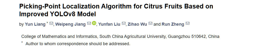 Liang Y, Jiang W, Liu Y, Wu Z, Zheng R. Picking-Point Localization Algorithm for Citrus Fruits Based on Improved YOLOv8 Model. Agriculture. 2025; 15(3):237. https://doi.org/10.3390/agriculture15030237