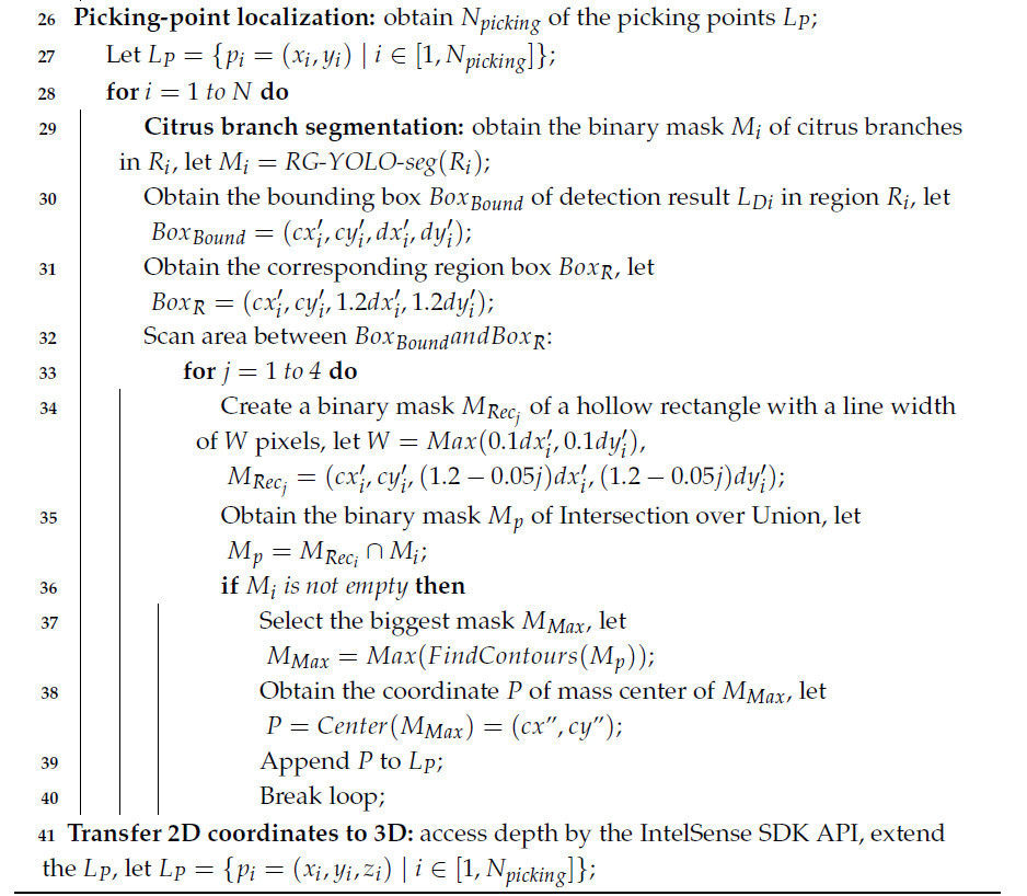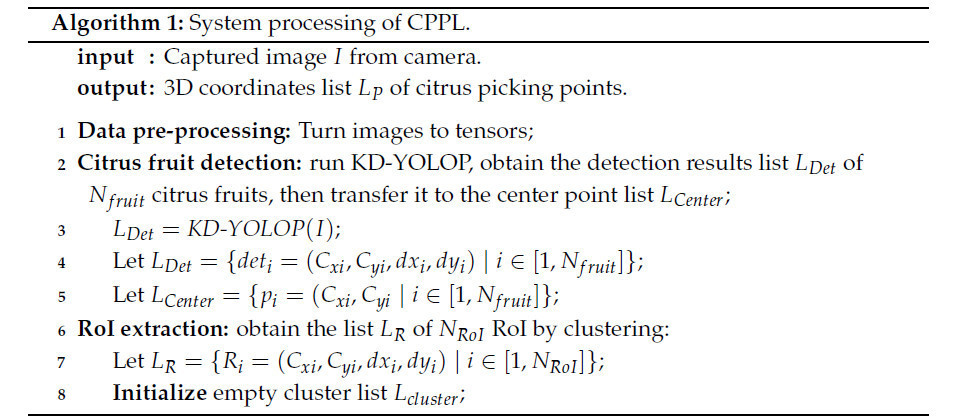 Предложенный новый и эффективный рабочий процесс для локализации точек сбора цитрусовых (CPPL) показан на Рисунке 2. Рисунок также демонстрирует наше аппаратное обеспечение, где рабочим органом роботизированной руки является самостоятельно разработанный ножничный резак, а камера, установленная на роботизированной руке, — Intel RealSense Depth Camera D435i. На первом этапе захваченное изображение передается в наш предложенный алгоритм KD-YOLOP для обнаружения плодов цитрусовых. Затем результаты обнаружения используются для получения области интереса с помощью алгоритма пространственной кластеризации. На втором этапе извлеченные области интереса передаются в наш предложенный RG-YOLO-seg для инстанс-сегментации ветвей цитрусовых. Наконец, результаты обнаружения плодов цитрусовых и результаты сегментации ветвей цитрусовых используются для локализации точек сбора всех извлеченных областей интереса с помощью нашего разработанного алгоритма обработки изображений и логики. Координаты точек сбора преобразуются в трехмерные путем доступа к глубине захваченного изображения; впоследствии робот для сбора урожая воздействует на эти координаты одну за другой. Чтобы проиллюстрировать это более ясно, мы представляем следующий псевдокод в Алгоритме 1.