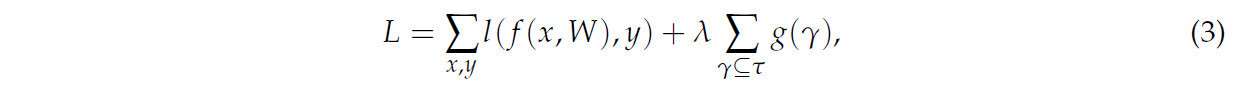 В Уравнении (3) l представляет исходную функцию потерь модели, где (x, y) соответствует обучающим данным и меткам. W обозначает обучаемые параметры модели, в то время как g(·) представляет член штрафа, применяемый к масштабирующему коэффициенту. Параметр λ служит балансирующим фактором, контролирующим компромисс между исходной потерей и членом регуляризации. Наконец, γ — это масштабирующий коэффициент, введенный во время разреженного обучения.