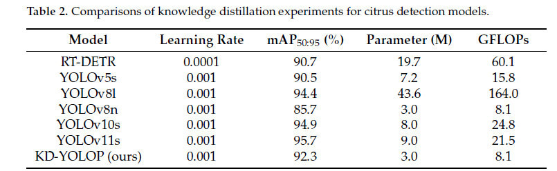 Таблица 2.Сравнение результатов экспериментов по дистилляции знаний для моделей обнаружения цитрусовых.