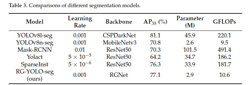 Предложенный алгоритм RG-YOLO-seg был оценен на наборе данных CBSD. Как показано в Таблице 3, мы сравниваем RG-YOLO-seg с четырьмя другими легковесными моделями инстанс-сегментации (YOLOv8n-seg, YOLOv8l-seg, Yolact [49], Mask-RCNN [50] и SparseInst [51]) с точки зрения средней точности, размера параметров (M) и GFLOPs. По сравнению с YOLOv8n-seg, который использует легковесный MobileNetV3 [52], наш метод демонстрирует схожее количество параметров и вычислительные затраты. Однако он превосходит YOLOv8n-seg, достигая на 6.3% более высокой точности сегментации. Эти результаты подчеркивают конкурентоспособность нашего метода в балансировании точности и задержки.