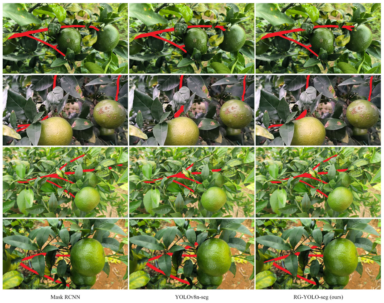 Рисунок 11 представляет экспериментальные сравнения на наборе данных CBSD незрелых плодов. Первый, второй и третий столбцы показывают результаты YOLOv8n-seg, Mask-RCNN и RG-YOLO-seg соответственно. Для спелых плодов показана цветовая разница между плодами цитрусовых и ветвями цитрусовых. За исключением неверного предсказания, сделанного Mask-RCNN, два других метода успешно сегментируют ветвь, соединенную с плодом цитрусового. Сравнивая YOLOv8n-seg и RG-YOLO-seg, как показано в четвертой строке на Рисунке 11, предложенный RG-YOLO-seg успешно сегментирует ветви в ситуации затенения ветви листвой.