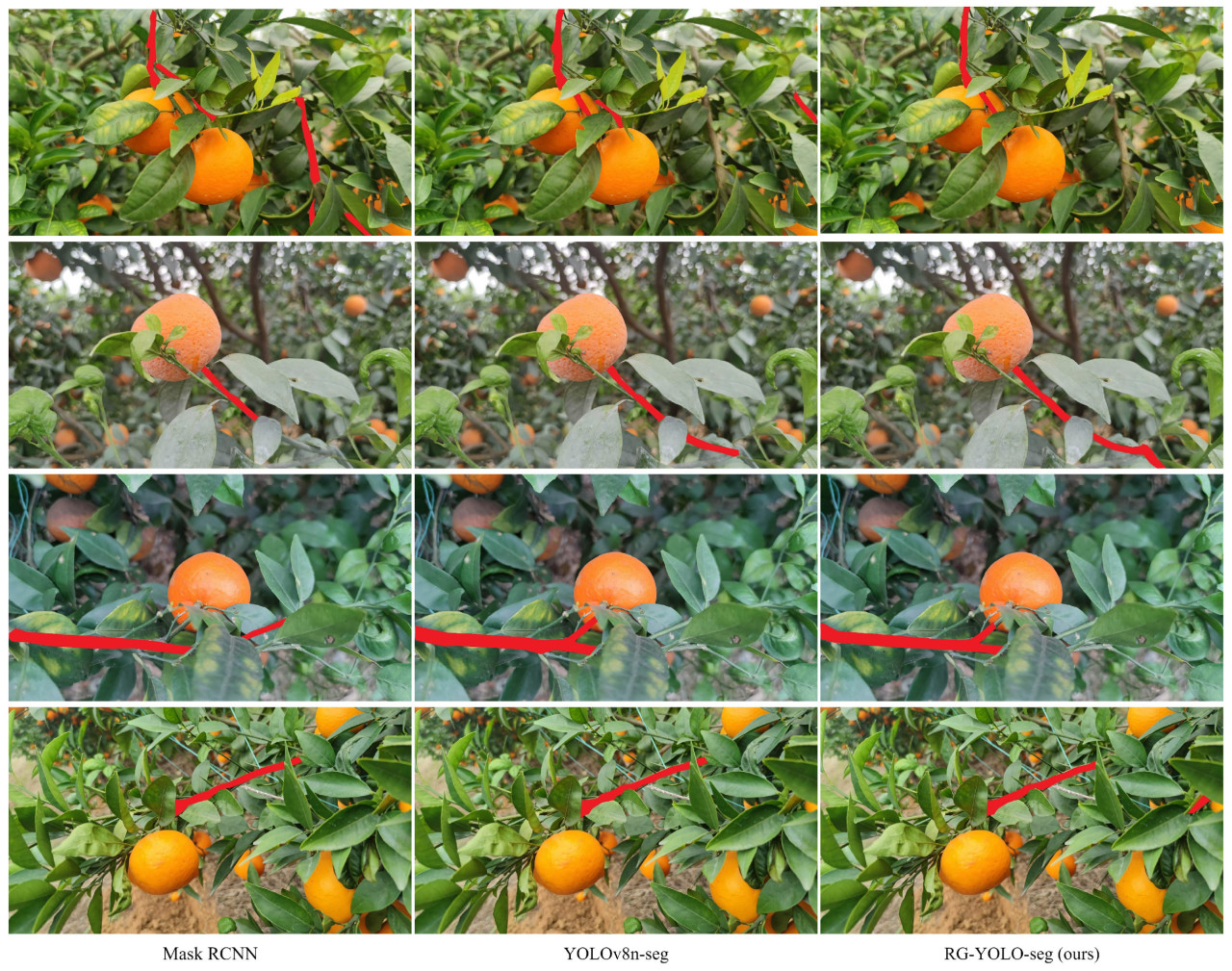 Рисунок 10 представляет экспериментальные сравнения на наборе данных CBSD незрелых плодов. Первый, второй и третий столбцы показывают результаты YOLOv8n, YOLOv8l и RG-YOLO-seg соответственно. Как показано в первой, второй и четвертой строках на Рисунке 10, предложенный RG-YOLO-seg успешно сегментирует наиболее полные результаты ветвей цитрусовых. Это означает, что RG-YOLO-seg более подходит для предложенного CPPL, так как он может объединяться с кластерными рамками цитрусовых, дальнейший повышая точность CPPL.