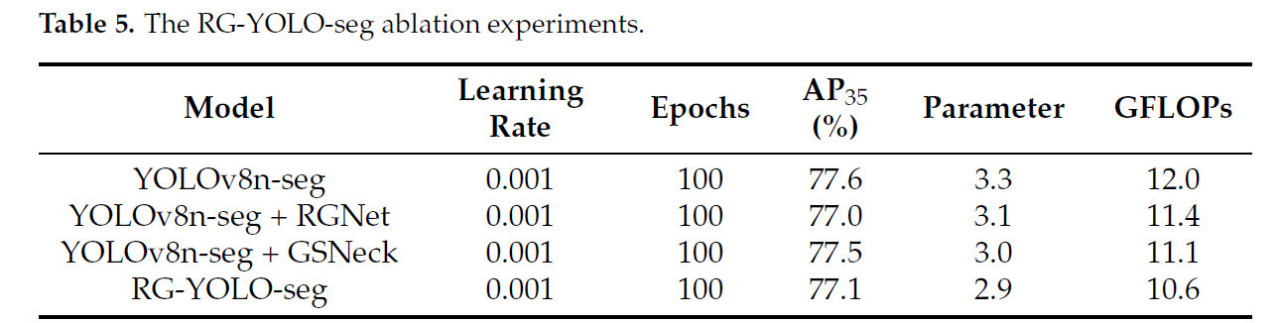 Таблица 5. Абляционные эксперименты RG-YOLO-seg.