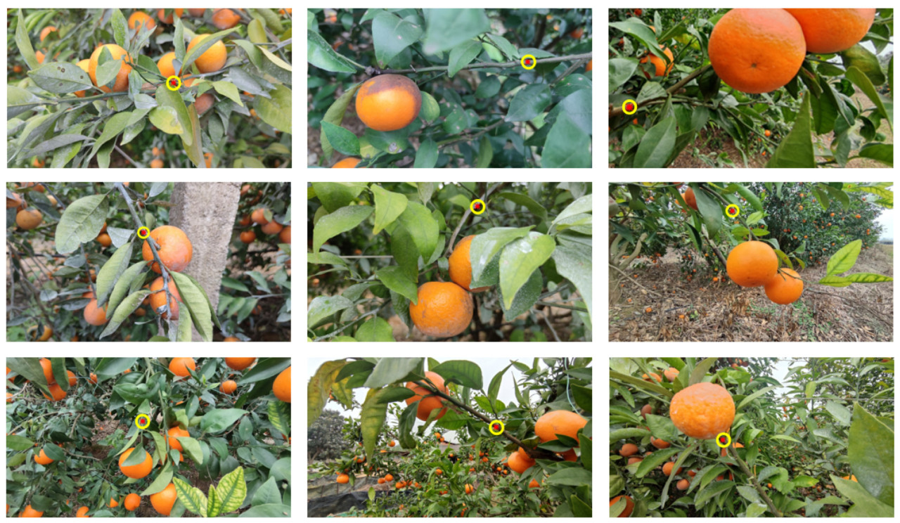 Как показано на Рисунке 14, мы тестируем наш предложенный CPPL в различных сценариях; красные точки внутри желтых кругов указывают местоположения точек сбора. Эти сценарии можно классифицировать по относительному положению целевого плода цитрусового и соединенной с ним ветви, включая сценарий «посередине» (как показано в первом столбце Рисунка 14), сценарий «слева» (как показано во втором столбце Рисунка 14), сценарий «справа» (как показано в первой и второй строках третьего столбца Рисунка 14) и особый сценарий «снизу вверх» (как показано во второй и третьей строках третьего ряда Рисунка 14). Эти результаты подтверждают, что предложенный метод сохраняет отличную точность локализации, одновременно обеспечивая эффективность модели.