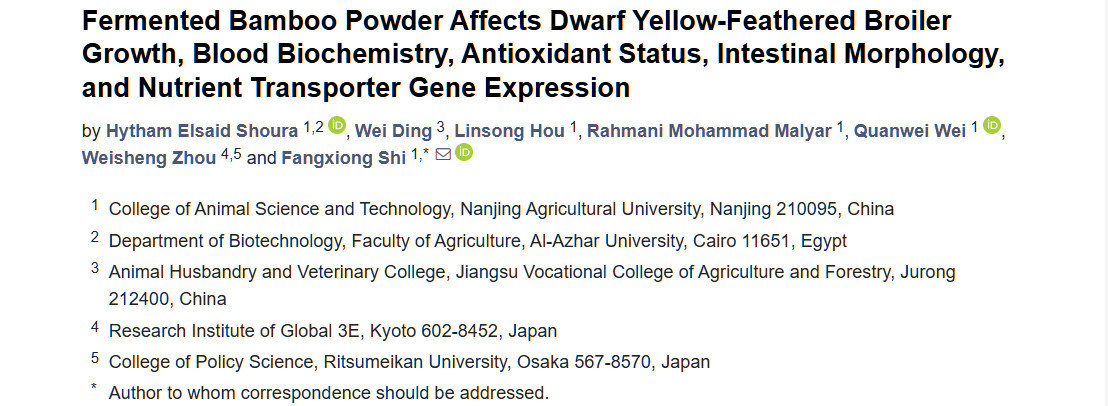 Shoura HE, Ding W, Hou L, Malyar RM, Wei Q, Zhou W, Shi F. Fermented Bamboo Powder Affects Dwarf Yellow-Feathered Broiler Growth, Blood Biochemistry, Antioxidant Status, Intestinal Morphology, and Nutrient Transporter Gene Expression. Agriculture. 2025; 15(3):240. https://doi.org/10.3390/agriculture15030240