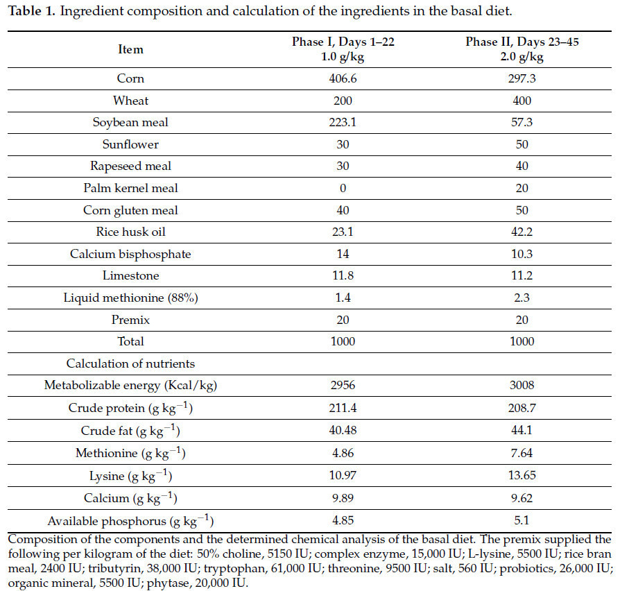 Группа из 600 суточных цыплят карликовых желтоперых бройлеров (DYB) со средней живой массой 52,16 ± 0,26 г была использована для этого эксперимента, получая стандартные протоколы вакцинации и неограниченный доступ к корму и воде в течение 45 дней. Испытание включало следующие два различных этапа: Фаза I (дни 1–22) и Фаза II (дни 23–45). Мы разделили цыплят на следующие две основные группы: контрольную группу (CON) и группу, получавшую добавку ФБП. Каждая группа имела 10 повторностей, каждая повторность включала 30 цыплят, выращенных на подстиле. Контрольная группа получала базовый рацион на протяжении всего эксперимента. Группа ФБП получала различные эквиваленты ФБП (1,0–2,0 г/кг) в каждой фазе в соответствии с их потребностями в питании.