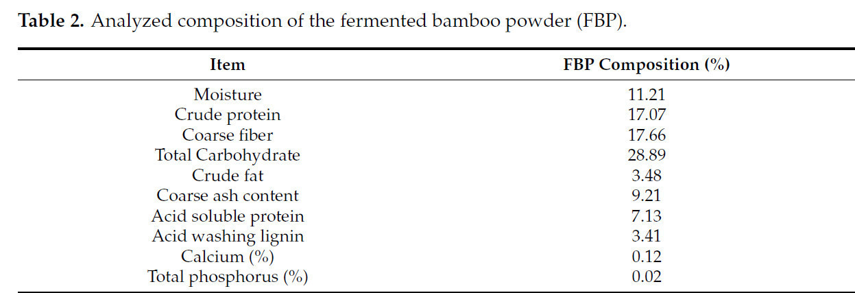 Бамбук, многолетнее растение с древесной текстурой, широко распространенное в мире, относится к подсемейству Bambuseae и семейству Gramineae. Являясь ведущим производителем, Китай вносит значительный вклад в мировое предложение бамбука, предоставляя большие объемы по низкой цене [1]. На долю бамбука приходится почти 3% площади мировых лесов [2]. Известный своим быстрым ростом и высоким производственным потенциалом, бамбук выделяется как ключевой возобновляемый ресурс с широким географическим распространением [3]. Состав бамбука обогащен различными физиологически активными соединениями, преимущественно флавоноидами, полисахаридами и фенольными кислотами, которые оказывают значительное влияние на цыплят [4,5]. Кроме того, бамбук содержит существенное количество нерастворимых пищевых волокон (НПВ), которые могут положительно влиять на здоровье кишечника, использование питательных веществ и поведение бройлеров [6,7]. Известно, что флавоноиды бамбука смягчают кишечное воспаление и модулируют иммунную активность в кишечнике [8]. Исследователи признают способность фенольных компонентов бамбука снижать риски ожирения печени, а также обеспечивать антиоксидантные и антибактериальные преимущества [9,10,11]. Благодаря процессу ферментации некоторые вещества могут быть более концентрированными и биодоступными в ферментированном бамбуковом порошке по сравнению с неферментированным бамбуковым порошком. Это может способствовать росту молочнокислых бактерий и повышать сбраживаемость субстрата [12]. Кроме того, процесс ферментации бамбука может приводить к значительному увеличению содержания сырой клетчатки и сырого протеина, достигая 10,76% сырой клетчатки и 15,20% сырого протеина, в зависимости от вида бамбука и конкретных используемых условий ферментации [13]. Кроме того, ферментированный бамбуковый порошок содержал следующие количества сухого вещества (89,80%), сырого протеина (2,28%), сырого жира (0,18%), кислотно-детергентной клетчатки (47,36%), кальция (0,12%), общего фосфора (0,02%) и валовой энергии (16,85 МДж/кг) при скармливании животным [14,15].