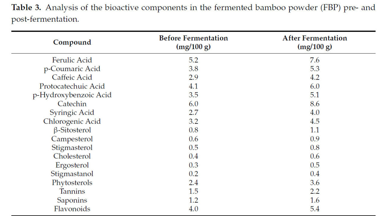 Таблица 3. Анализ биоактивных компонентов в ферментированном бамбуковом порошке (ФБП) до и после ферментации.