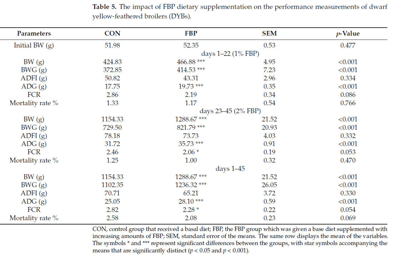 Таблица 5. Влияние диетической добавки ФБП на показатели продуктивности карликовых желтоперых бройлеров (DYB).