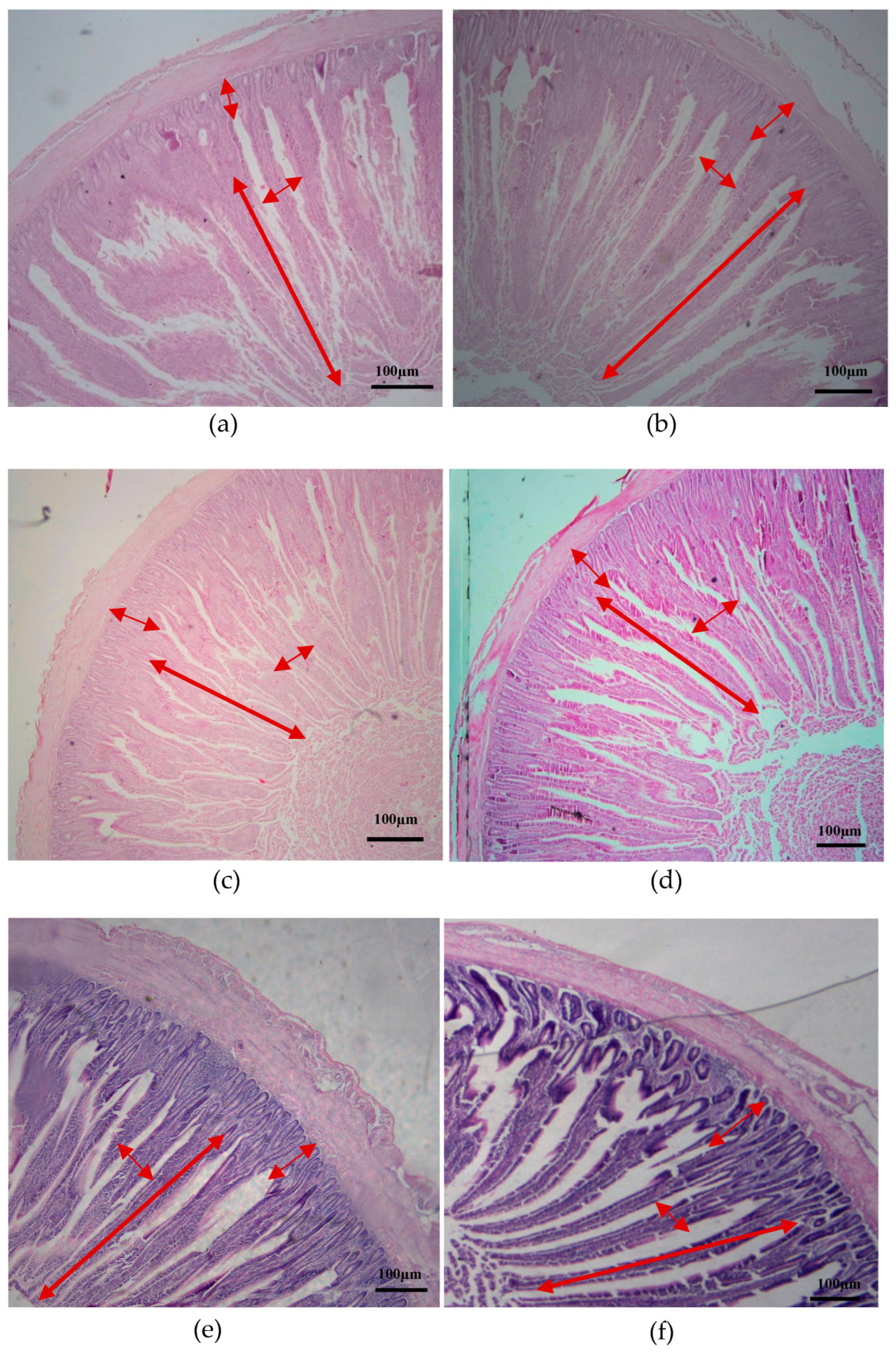 Рисунок 2. Морфология отделов кишечника при контрольном кормлении и кормлении с ФБП цыплят DYB. (a,b) Двенадцатиперстная кишка групп CON и ФБП; (c,d) Тощая кишка групп CON и ФБП; (e,f) Подвздошная кишка групп CON и ФБП при увеличении 40×. Масштабная шкала = 100 мкм. Красные стрелки показывают высоту ворсинки, ширину ворсинки и глубину крипты.